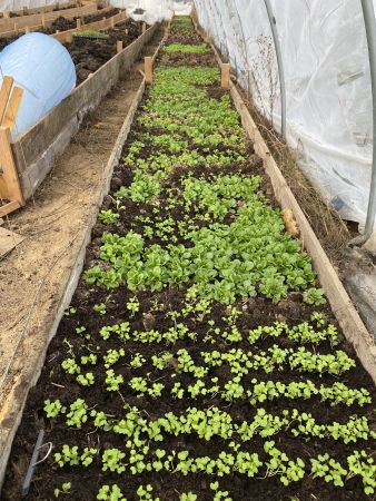 Bei dem super Wetter gestern haben wir rund 1000 Salatpflanzen in das Gewächshaus gepflanzt(Feldsalat, Asiasalate und Eichblatt). Unser Luftpolsterbahnen zum Frostschutz haben wir bisher noch nicht gebraucht.