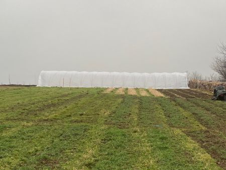 Wir haben die letzten beiden Tage mit schönem Wetter genutzt um unseren ersten Wandertunnel zu stellen, der mit den Maßen 5,50 m x 20 m ausschließlich für Tomaten reserviert ist. Wir haben 5 Beete a 20 m länge und 75 cm breite angelegt, wo schon im vergangenen Jahr winterharte Gründüngung eingesät worden ist, die dann, vor der Pflanzung der Tomaten die sich gerade in der Voranzucht befinden, als Dünger in den Boden eingearbeitet wird. Der Tunnel hat dann Platz für 250 Tomatenpflanzen