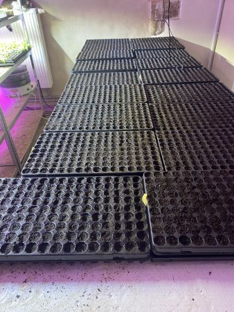Jetzt beginnt die Anzucht von Baby Leaf Salat für unser Gewächshaus. Die Pflanzen können dann voraussichtlich Ende Januar ins Gewächshaus und stehen Ende Februar zur Ernte bereit. Vorgezogen werden in der ersten Runde Red Giant, Wasabino und Moutarde Rouge Metis. Vorgezogen wird in 18 x 144 Quickpot mit je 4 Samen pro Multitopf, da der Salat eng steht und früh geerntet wird. Zusammen sind das ca. 8.800 Pflanzen(bei Keimfähigkeit 85 %) gesetzt in 8 Reihen a 2cm Abstand ergibt das geplante 6 Beetmeter. Platzbedarf für die Anzucht knapp 4 m² mit einer Keimtemperatur zwischen 15 und 20 Grad. Dazu noch 2 *144 Quickpot Eichblattsalat Till für das Gewächshaus. Nächste Woche geht es dann weiter.