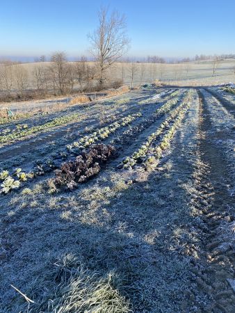 Komplett durchgefroren. Im Vordergrund Wirsing, Weißkohl und der rote Grünkohl.