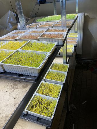 Was beim ganzen Gemüse immer zu kurz kommt, sind unsere Microgreens. Wir stellen wöchentlich ca. 120 große Schalen für die Gastronomie her. Aber auch für den privaten Gebrauch sehr lecker und gesund. In den Salat, auf Brot oder als Topping für Gerichte. Hier ein kleiner Blick in die Anzucht, wo die vorgezogenen Sprossen, noch 2 Tage keimen und wachsen dürfen. Samen alle Bio, und die Anzuchterde nach ökologischem Standard.
