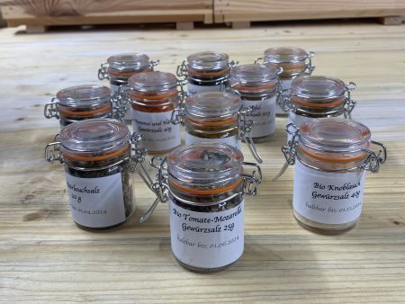 Aufgrund der vielen Anregungen unserer Kunden haben wir eine kleine Gewürzecke mit Bio-Gewürzen und Gewürzmischungen eingerichtet. Diese ergänzt unser bisheriges Angebot an Bio Pfeffer, Salz und  Bio Rohrzucker. Hier findet Ihr zum Beispiel Bio Tomate Mozzarella Gewürz und Bio Gemüsebrühe. Alles schön verpackt im wieder verwertbaren Glas mit Bügelverschluss.