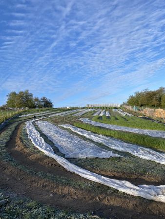 Freilandanbau birgt ein gewisses Risiko, gerade in unserer Höhenlage. Gestern Nacht hatten wir starken Frost. Wir haben zwar alle unsere Kulturen mit Vlies abgedeckt, aber ob das reicht werden wir in den nächsten Tagen sehen. Um im Mai mit unseren Gemüsekisten anzufangen und auch unsere Restaurants zu beliefern haben wir zur Zeit mehrere Sätze Blumenkohl, Spitzkohl, Weißkohl, Brokkoli, Kohlrabi und Romanesco im Beet( 1 Satz Kohl sind zwischen 180 und 200 Pflanzen), dazu mehre Sätze Zuckerschoten, Dicke Bohnen, Spinat, Mangold, Schalerbse, Frühlingzwiebel, Fenchel und natürlich Salate. Ausgesät sind Radieschen, Rettich, Mairübe, Stielmus,, Kohlrübe, Kerbelrübe und Wurzeln. Dazu noch Winterknoblauch und Zwiebeln. Hoffen wir mal, dass der Ausfall nicht zu hoch ist.
