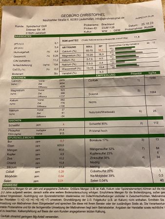 Da ein guter Boden die Basis für jeden Anbau ist, haben wir eine Bodenanalyse nach Albrecht erstellen lassen. Wir haben die Proben in dem Bereich entnommen, der noch nicht für den Anbau genutzt worden ist, also fast ein Jahr lang brach lag. Das Gute vorab, wir haben genug Kalium im Boden und der PH-Wert ist gut., und das war es dann auch schon. Um unseren Boden dahin zu bringen, dass wir in den kommenden Jahren bessere Ernten haben müssen wir Calcium, Magnesium, Natrium, Schwefel, Börsäure, Mangansulfat, Kupfersulfat, Zinksulfat, Cobaltsulfat, NA-Molybdat und Selen in unterschiedlichen Mengen zuführen. Der Humusgehalt in diesem bisher nicht genutzten Boden liegt bei 4,6 %, ist also faktisch nicht vorhanden. Da wir aber dieses Jahr schon einiges ernten konnten, kann man sehen, was man mit Gründüngung, Schafwollpellets und unserem guten Pferdemist alles erreichen kann.